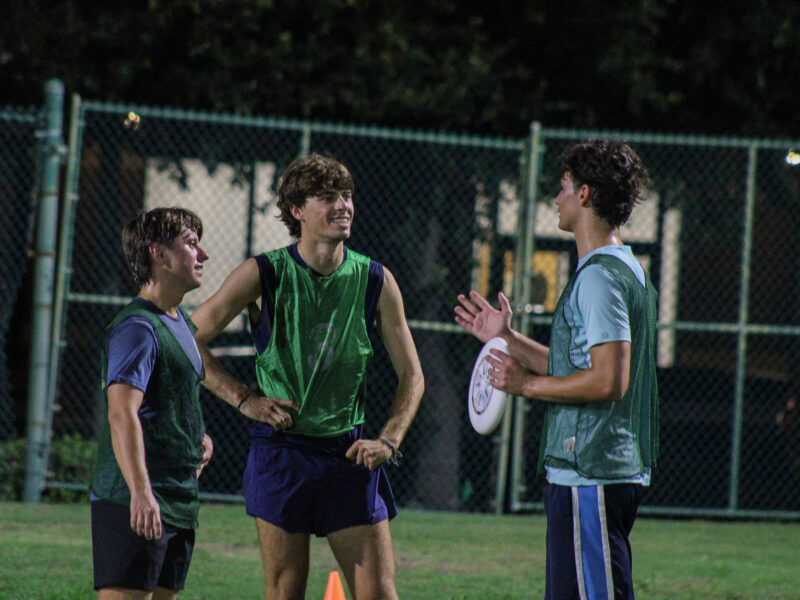 Members of the Ultimate Frisbee Club chatting in between plays. Photo by Irena Mesa Ultimate frisbee is best described as football but played with a frisbee. Teams of seven face