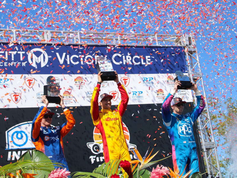 Scott Dixon, Àlex Palou, and Josef Newgarden holding up their trophies from the St. Petersburg Grand Prix. Photo by Irena Mesa. By Irena Mesa Àlex Palou started 8th at the