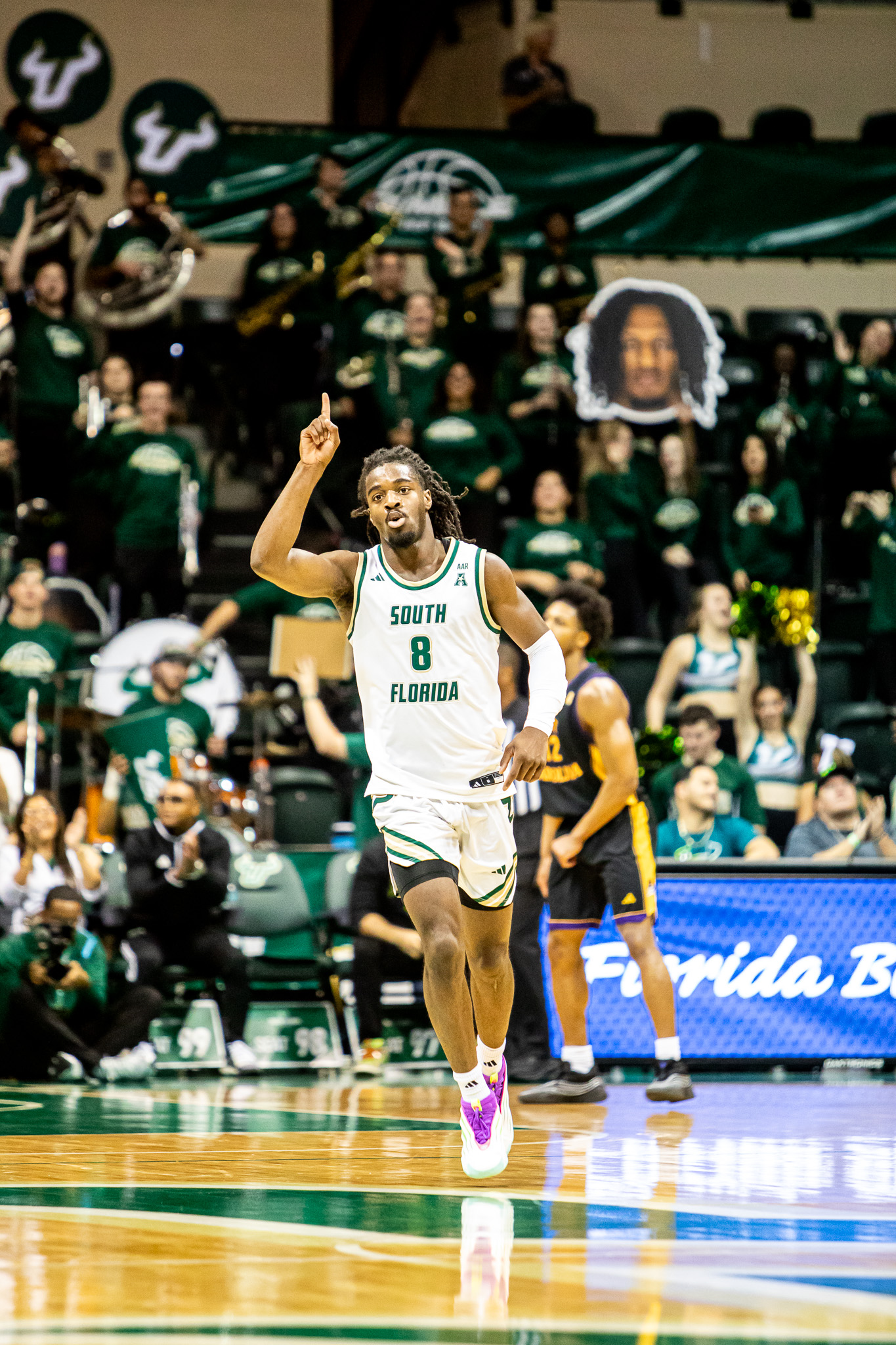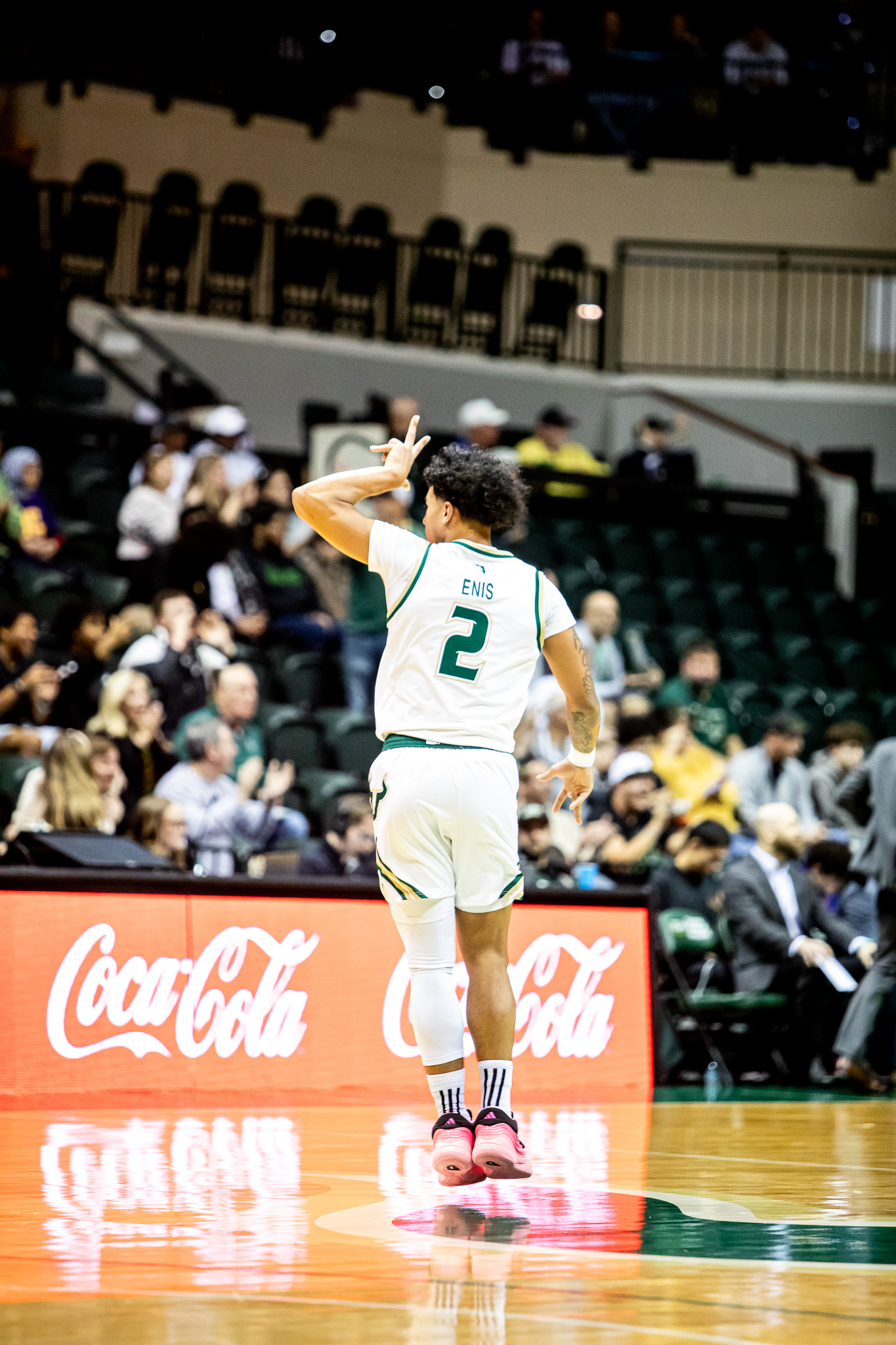 Wes Enis celebrating a made three-pointer during USF’s 82-71 win over East Carolina University.