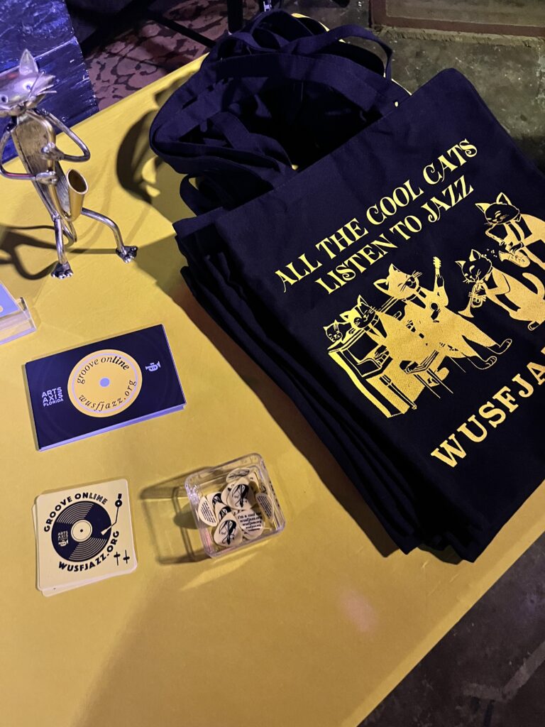 WUSF offers stickers, tote bags, has CDs and records for sale that serve as donations for the organization. Photo by Julia Ferrara | The Crow’s Nest