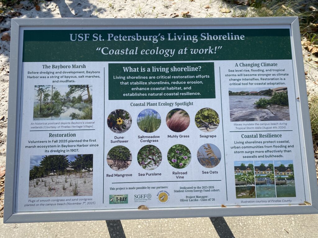 Laczko discussed the progress of the living shoreline that SGEF installed on the USF St. Petersburg’s campus beach in November 2025.