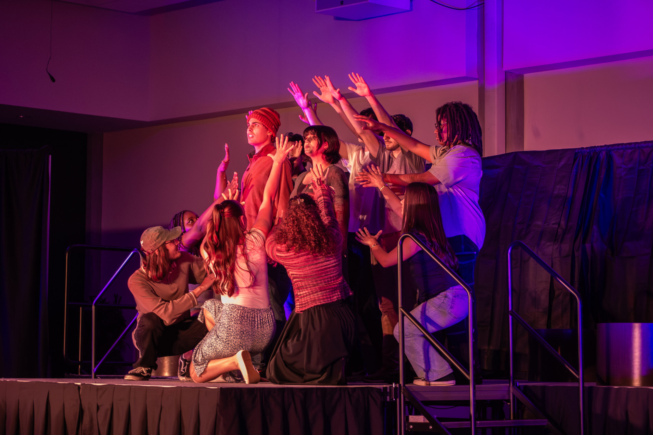 One stand lit the background blue and purple, which is reminiscent of the colors of the galaxy and contributed to the science-influenced theme of the musical. The other light stand was used to light the actors onstage with a warm white, which aided with the intimate and often vulnerable nature of the production.