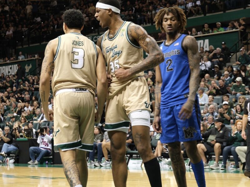 Isaiah Jones (left) and Izaiyah Nelson (right) during the University of South Florida’s 87-66 win over the University of Memphis on Feb. 19 Photo by Gabriel Ballester-Rivera | The Crow’s